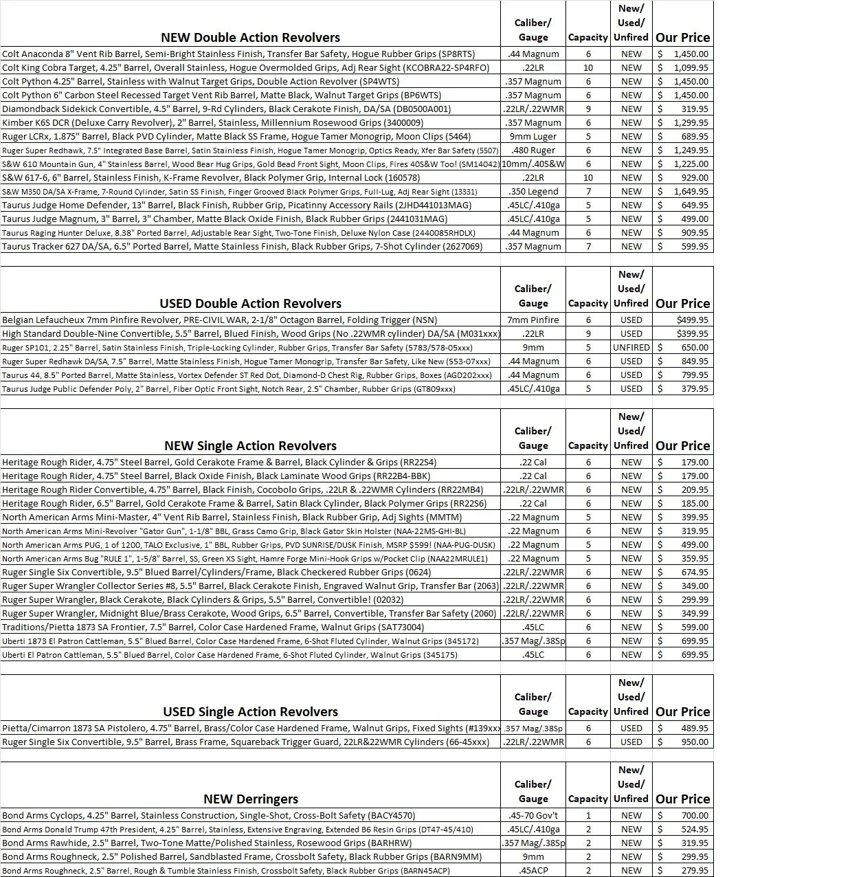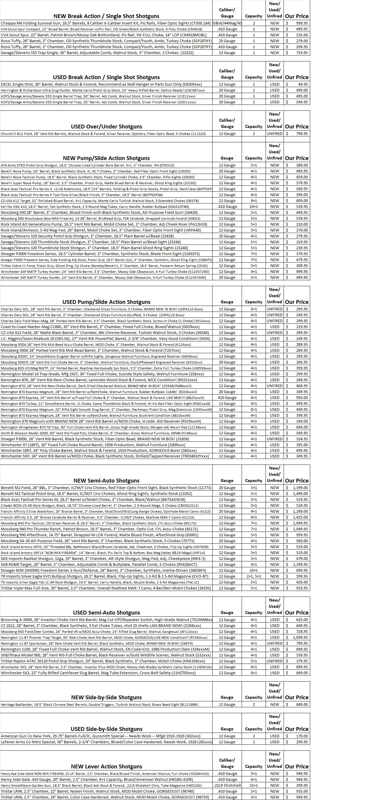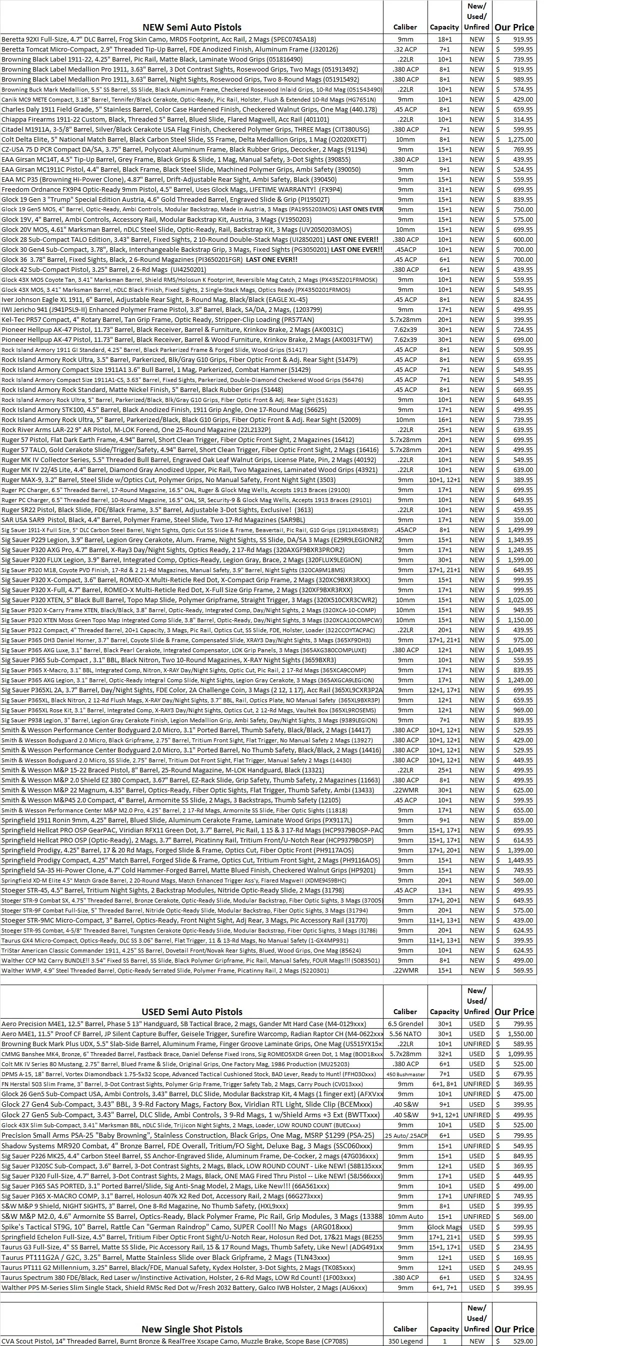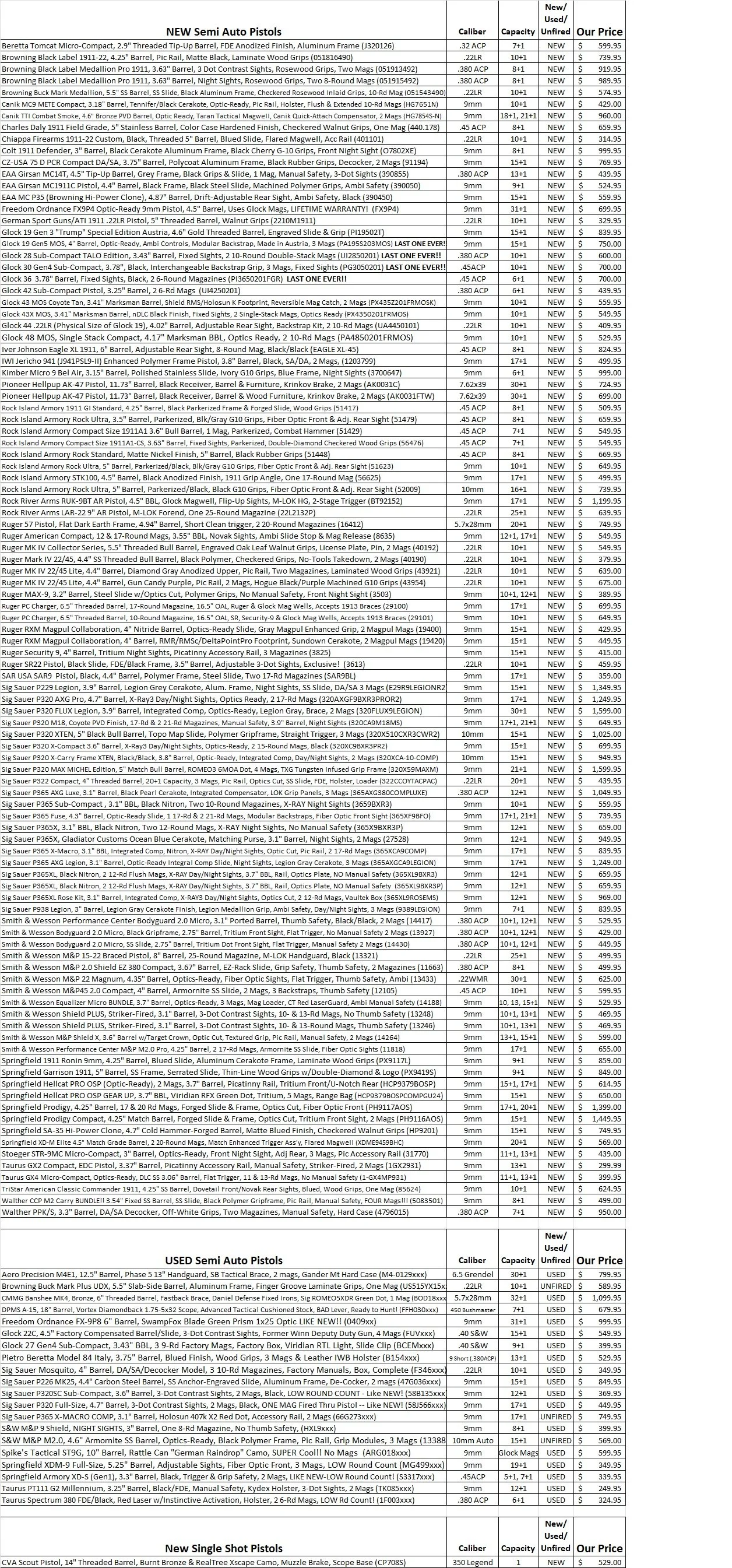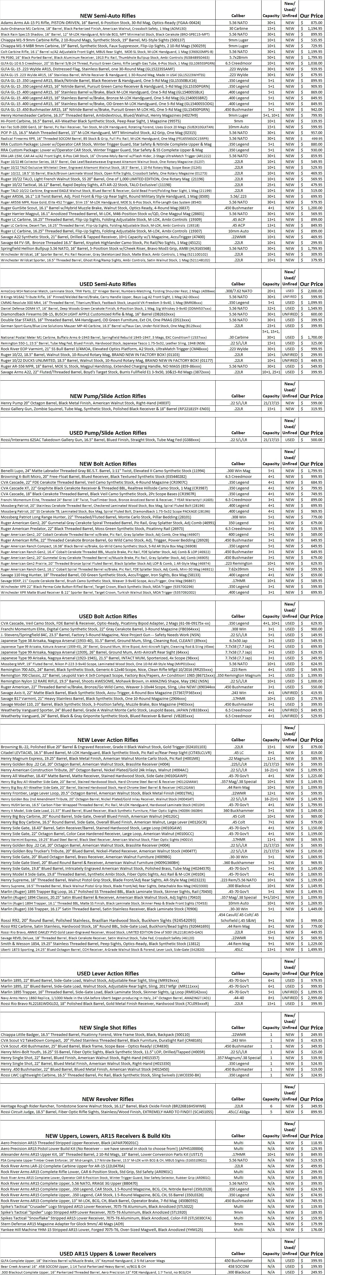 Please call or visit us in person to check in-stock status for any particular firearm, receiver, upper or accessory. I will do my best to keep the website inventory updated frequently, but time is precious and inventory is constantly changing!